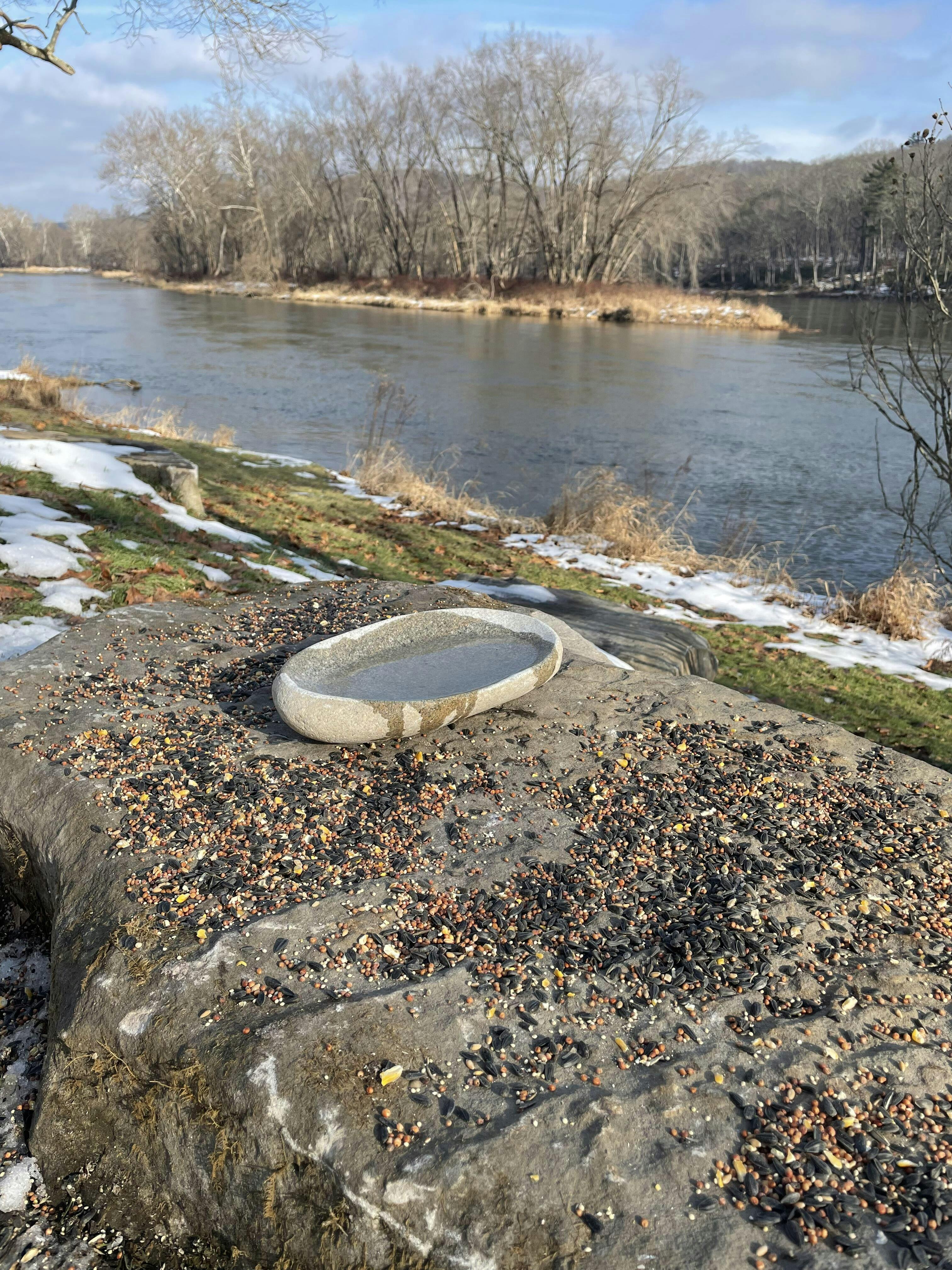 You just might enjoy this river stone birdbath more than your birds! The shallow pool is perfect for birds to drink and bathe. Each stone used to make a birdbath is a beautiful, one-of-a-kind river rock carved by nature and handmade right here in New Hampshire. This listing is for one (1) birdbath which measures approximately 9-11”L x 7-10”W x 2-4” H.