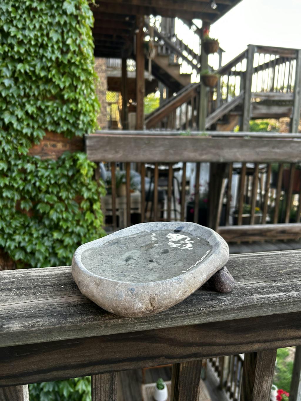 I love my stone birdbath, it is beautiful. The reddish stone looks wonderful on my redwood deck. I’m still waiting for my birds to discover it, but even without birds in it it makes me happy!